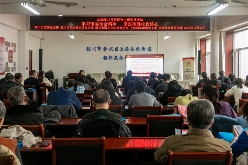 为持续掀起学习宣传贯彻党的二十届四中全会、宁夏回族自治区党委十三届十一次全会、银川市委十五届十四次全会精神热潮,凝聚“百日攻坚战”的磅礴力量,确保全年目标任务圆满收官,按照银川市直机关工委12月份“支部主题党日”活动要求,2025年12月12日上午,由银川市文联党支部、银川市司法局党支部、银川市国立公证处党支部、银川市金凤区上海西路街道党工委、银川市金凤区上海西路街道银新苑南社区党委,在银新苑南社区共同开展了“学习市委全会精神,坚定决胜收官信心”主题党日活动。