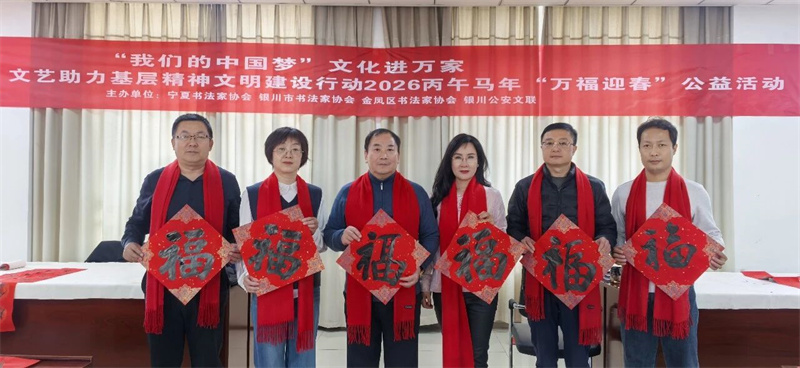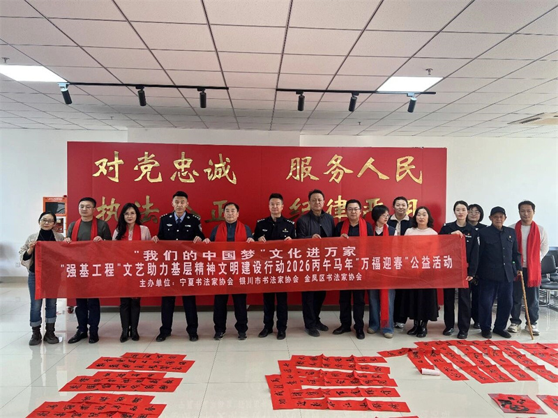 为认真落实中国文联2026年“强基工程”新春特别行动部署要求,广泛走进各行各业,为基层群众送春联、福字,丰富群众的节日文化生活,2026年2月5日,由宁夏书协、银川市书协、金凤区书协主办,金凤区文联、银川公安文联承办的2026年“强基工程”新春特别行动——“我们的中国梦 文化进万家”走进银川市公安局“万福迎春 写春联”文艺志愿服务活动在银川市公安局火热开展。