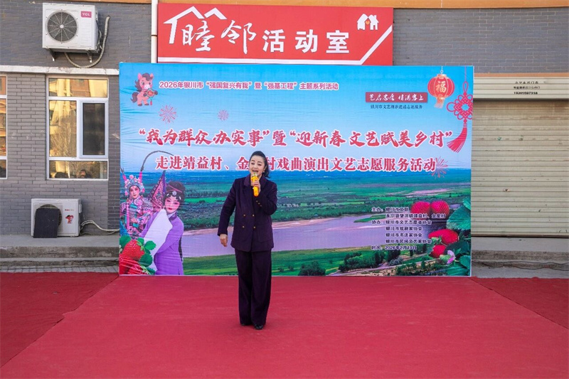 为认真落实中国文联“强基工程”2026年新春特别行动及银川市全国文明城市创建工作部署要求,大力弘扬中华优秀传统文化,引导群众进一步铸牢中华民族共同体意识,用文艺的生动形式,营造喜庆祥和的节日文化氛围,丰富群众的精神文化生活,增强群众的精神力量,助力乡村全面振兴,提升城市文化品质,2026年2月10日,正值丙午马年小年,由银川市文联、永宁县望洪镇靖益村、金星村共同主办,银川市文艺志愿者协会、银川市戏剧家协会、银川市书法家协会、银川市民间文艺家协会承办的“我为群众办实事”暨“迎新春 文艺赋美乡村”文艺志愿服务活动在银川市文联结对村——宁夏银川市永宁县望洪镇靖益村、金星村欢乐举办。