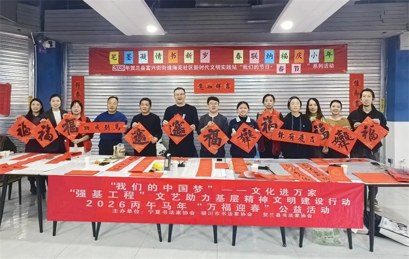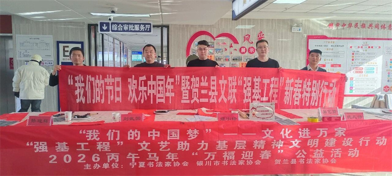 2026年2月11日,由宁夏书法家协会、银川市书法家协会、贺兰县书法家协会主办的“我们的中国梦 文化进万家”——“丙午马年 万福迎春 送春联”文艺志愿服务活动在贺兰县政务服务中心温暖举办。活动现场,贺兰县书协5位书法家,为该中心的工作人员书写春联及福字近400副。书法家们书写的春联内容,除了传统经典联句外,还应群众需求,书写了如“日日是好日,时时皆清欢”“平安喜乐常相伴,心想事成皆如愿”等充满时代气息的新式联语。此次活动将政务服务空间转化为一座传递城市温度的“文化驿站”,让群众于笔墨纸砚间感受中华优秀传统文化的深厚魅力,也将艺术家们对他们的节日祝福与人文关怀送达到群众心里。