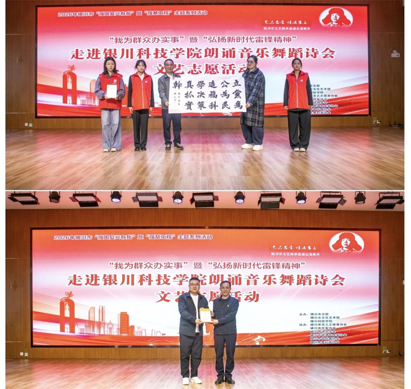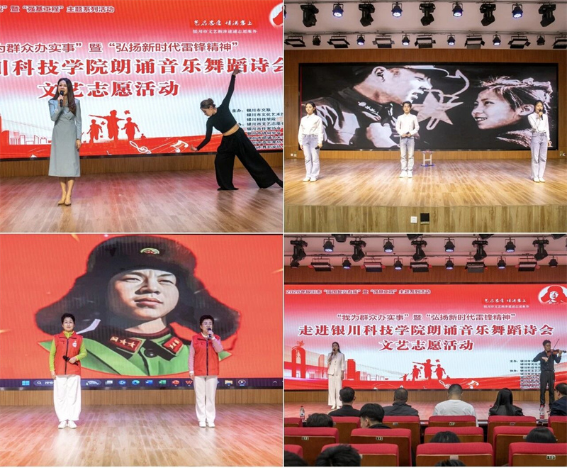 三月塞上春风暖,雷锋精神永相传。2026年3月25日,在“学雷锋月”主题活动开展之际,银川市文联携手宁夏文联、银川市文化艺术馆走进银川科技学院开展“弘扬新时代雷锋精神”文艺志愿惠民演出,以朗诵、音乐、舞蹈等相融合的艺术形式,为师生送上一场兼具思想温度与艺术美感的文艺盛宴,让雷锋精神在文艺浸润中薪火相传。